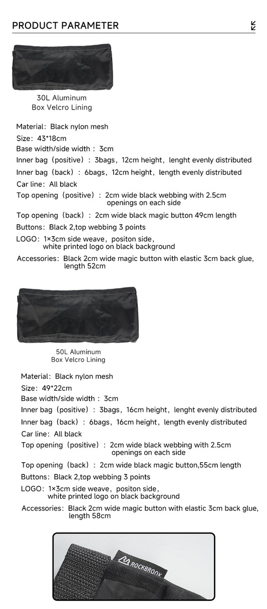 ロックブルック ブラックアルミボックス ナイロンメッシュ 裏地内蔵 ベルクロ付き 30L・50Lボックス用 Rockbrook BLACK Aluminum Box Nylon Mesh Built-In Lining with Velcro ( BX1003IBS / BX1003IBM )