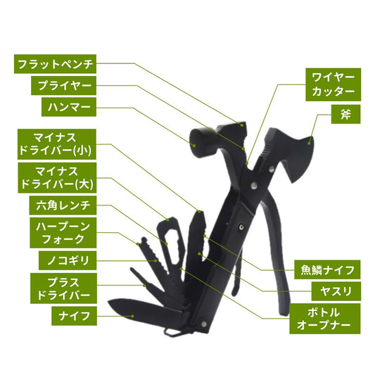 DOEARTH Wildmaster 多機能ペグハンマー 15機能 マルチツール 斧 ハンマー ペンチ 栓抜き ドライバー ナイフ のこぎり