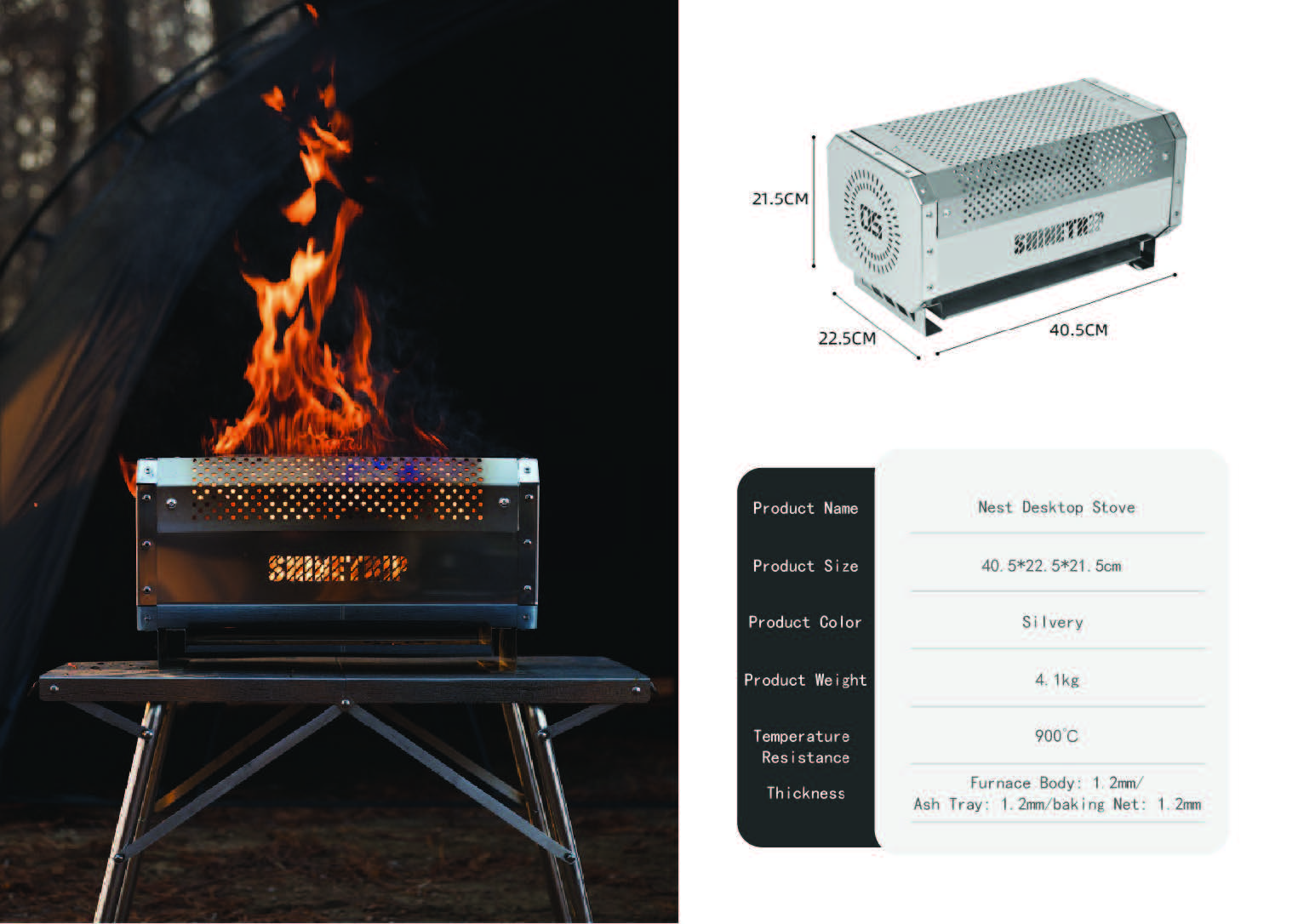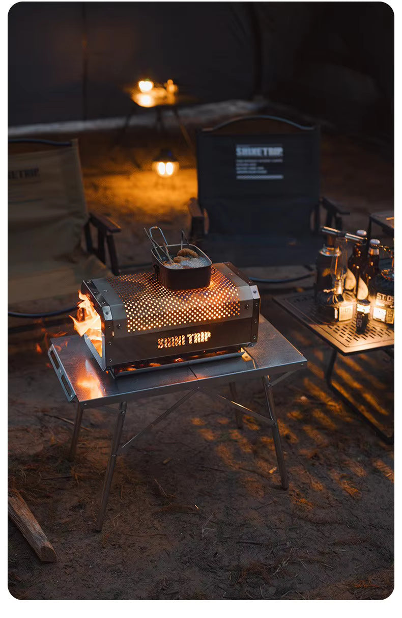 セットの卓上ストーブは耐熱温度900℃対応のステンレス構造で、焚き火台の代替や、風がある環境でも安定した熱源を確保したい場面で活躍します。テーブルと組み合わせることで「調理する場所」と「置く場所」を同時に整えられ、サイト内の動線が一気に良くなります。