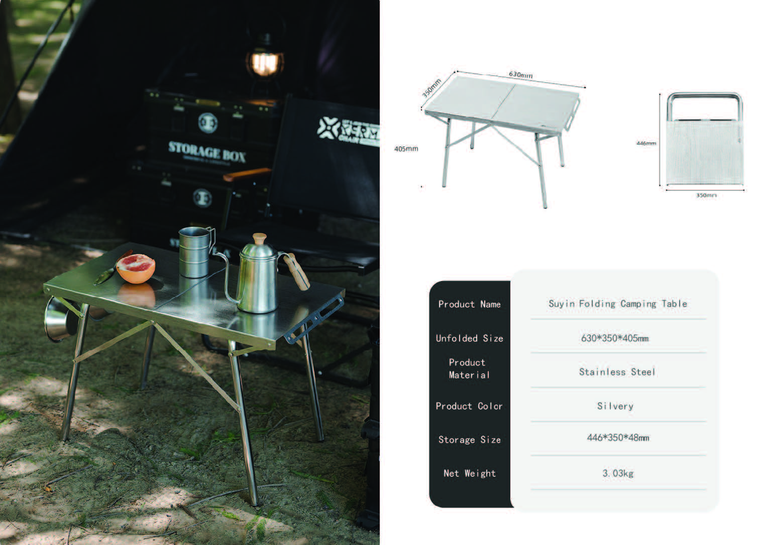テーブルはステンレス素材のため熱や汚れに強く、調理器具・クッカー・食材・小物類を置く作業台として安心して使えます。さらに折りたたみ式なので設営が早く、撤収もスムーズ。収納時は薄くまとまり、車載でもキャンプギアのスペースを圧迫しにくいのがポイントです。