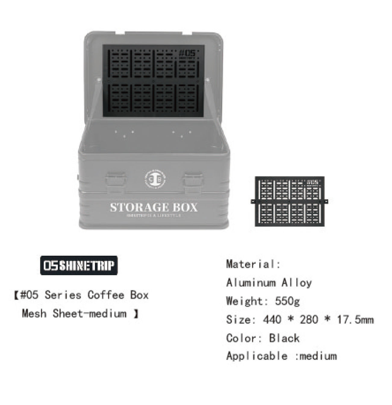 この**#05 Series Medium Coffee Box Mesh Sheet**は、ボックス内側へ装着することで、ギアを縦収納・壁面収納できるモジュールシステムパネルです。