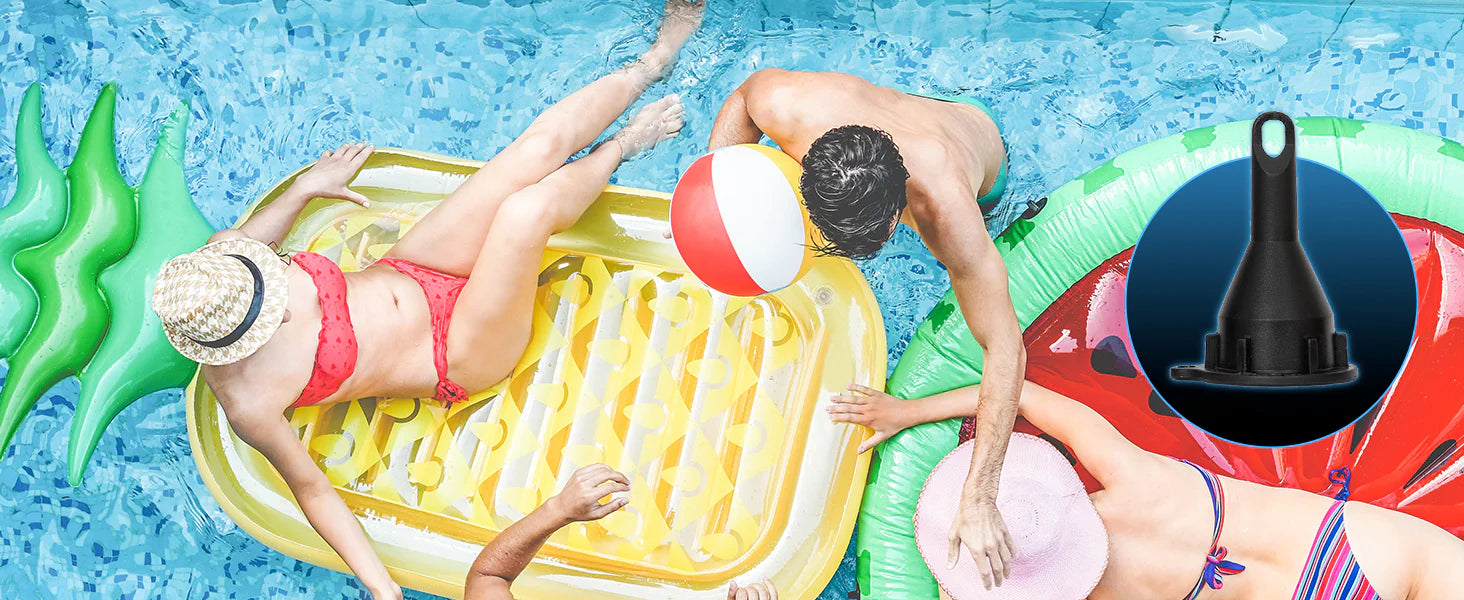 用途に応じて使い分けできる4種類のノズルが付属。浮き輪・プール用品からキャンプ用エアマットまで幅広く対応します。