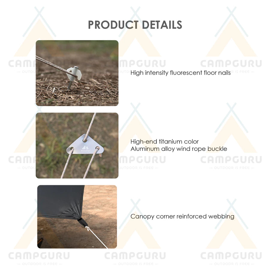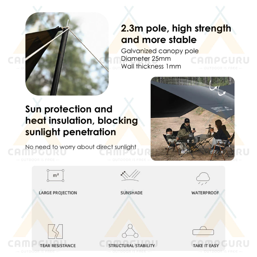 内部は圧着加工で防水性を高め、外側には耐摩耗テープ補強。付属ポールは**鍍亜鉛キャノピーポール(Φ25mm・t1.0mm)**で高強度を実現。5〜10人が快適に過ごせる広さで、ファミリーやグループキャンプに最適。