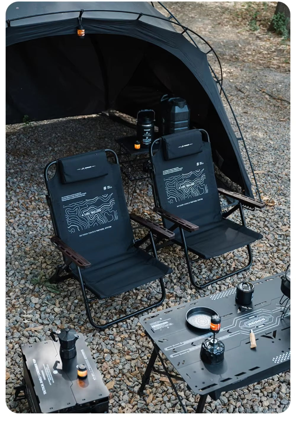 6段階調整可能なリクライニング構造により、食事・焚き火・リラックスタイムまで姿勢を自在に変更可能。背面にはゆったりと体を預けられる設計と、快適性を高める大型ピローを備えています。