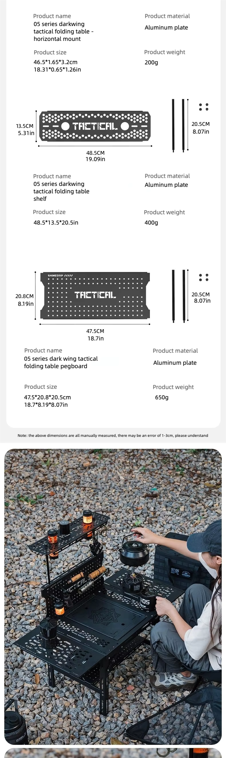 キャンプサイトで「テーブル周りが散らかる」「調理や作業スペースが足りない」「ギアを効率よく整理できない」といった悩みを解決するのが、SHINETRIP #05 Series Dark Wing Tactical Folding Table システム。