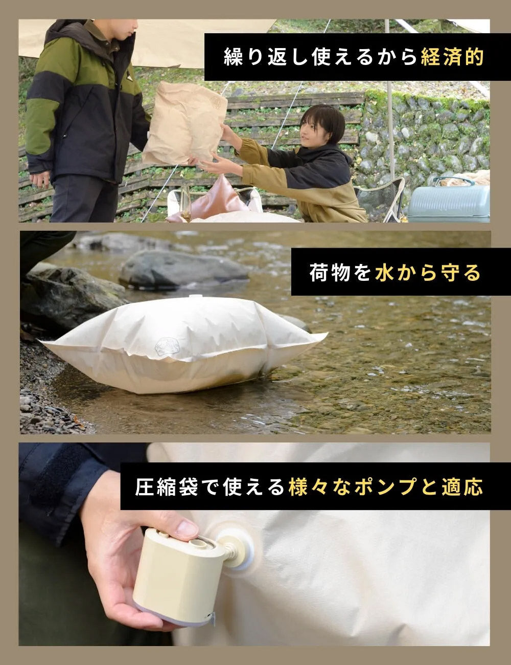 キャンプレッションバッグは基本的にエアポンプを使用する圧縮袋です。手動・電動関わらず圧縮袋と互換性のあるものであれば、どんなエアポンプでも適合します。他社製のエアポンプでも通常使用は何ら問題ありませんが、弊社の電動エアポンプ「ノブレスポンプ」を使用することでキャンプレッションバッグの性能をフルに発揮させることができます。