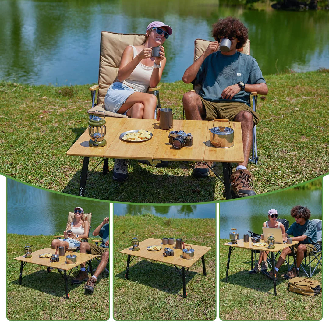 自然の風合いが美しい竹製天板(100×70cm)と、剛性の高い6063アルミ合金フレームを採用した折りたたみテーブル。