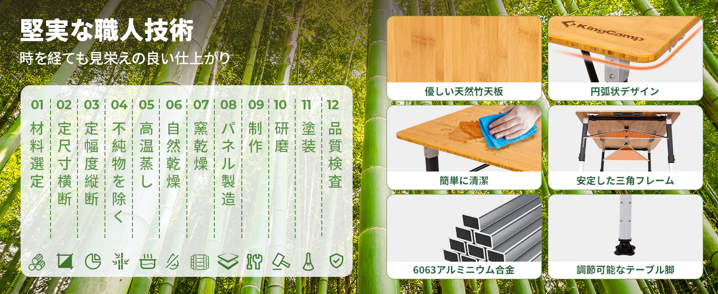 【KingCamp|キングキャンプ】Bamboo P12080|竹製キャンプテーブル 120×80cm 高さ無段階調整 折りたたみ式 大型4〜6人用