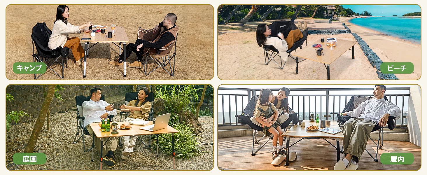 2折式の天板は持ち運びや収納も簡単。安定性が高く、キャンプやピクニック、BBQなど幅広いシーンで活躍します。
