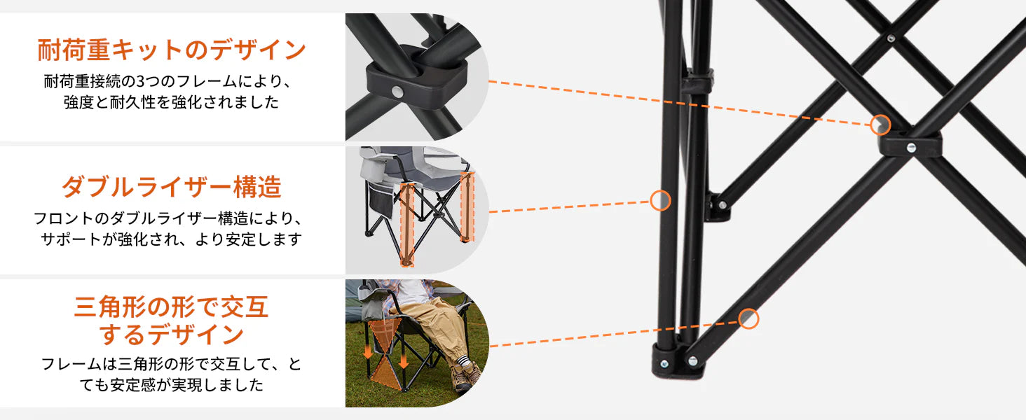 Q195スチール製φ22mmパイプを三角形構造で組み合わせ、抜群の安定性を確保。フレームと生地の接合部はプラスチックで補強され、厚手の600Dオックスフォード生地を採用することで高い強度と耐久性を実現しています。