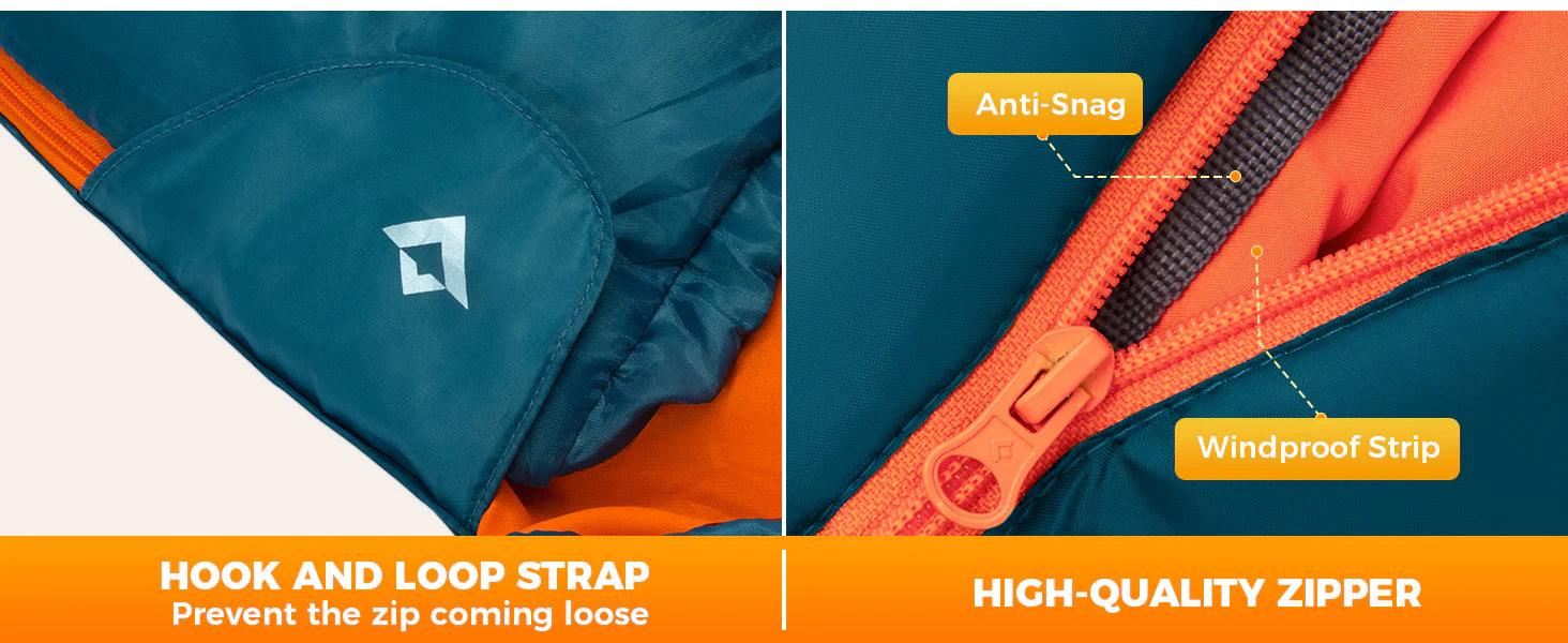 【KingCamp|キングキャンプ】TIGRIS 250|フード付き封筒型寝袋|コントラストカラー・スタイリッシュモデル(ピーコックブルー)