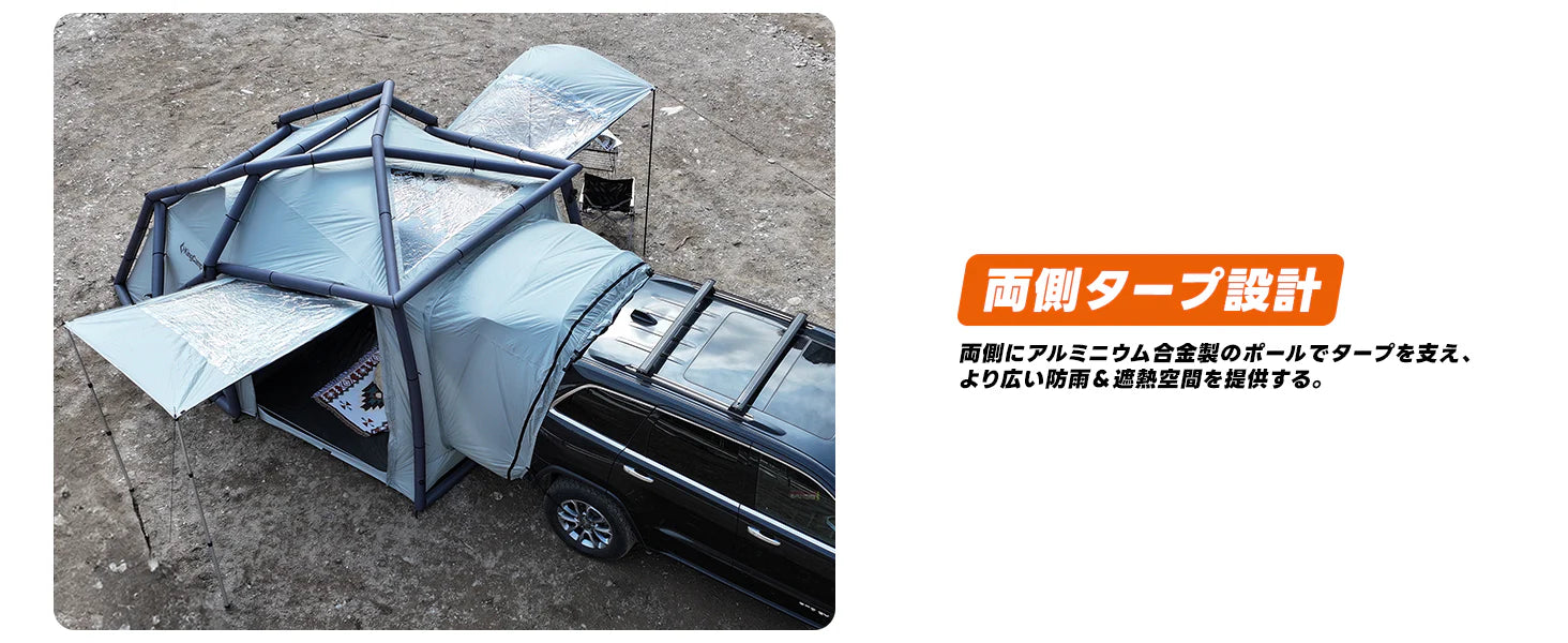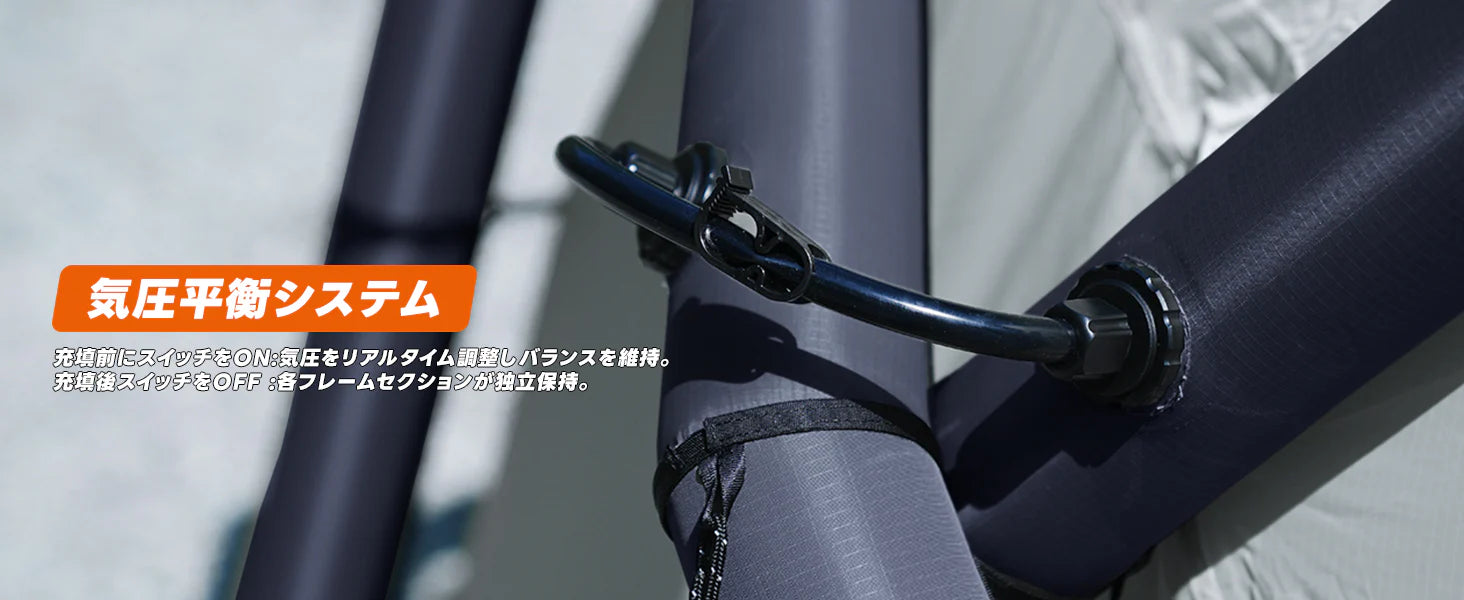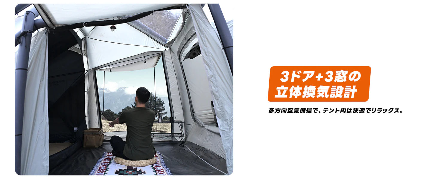 大口径バルブと付属エアポンプで、わずか3分で設営できる最新充気式カーテント。外置き交差エアポール構造を採用し、耐風圧性能・構造剛性を大幅に強化。強風下でも安定性を維持する気圧分散機構を搭載。