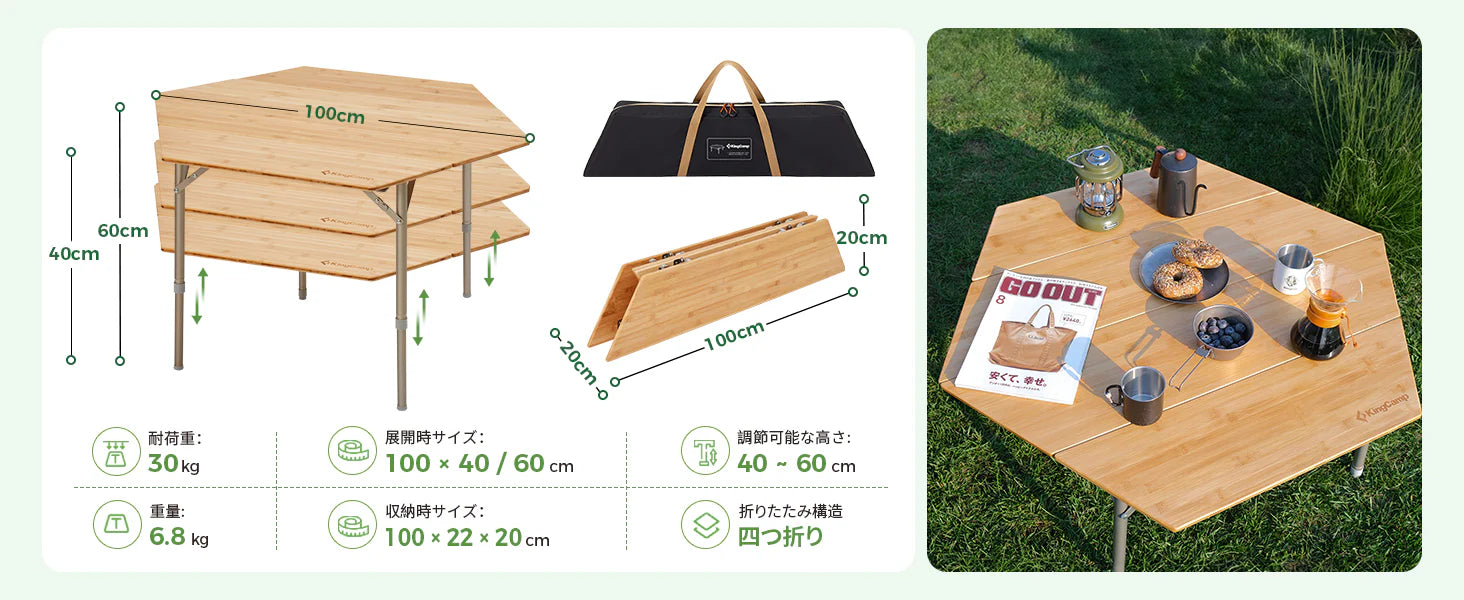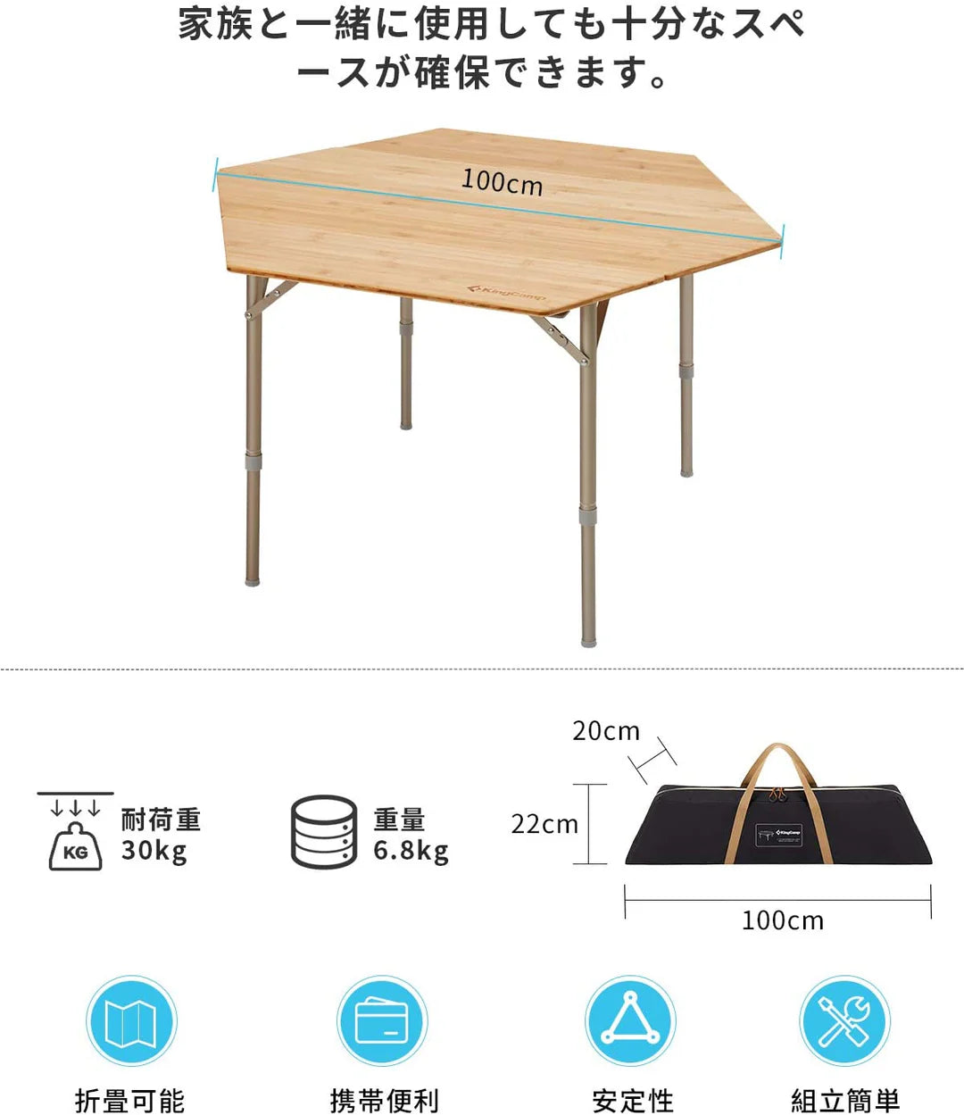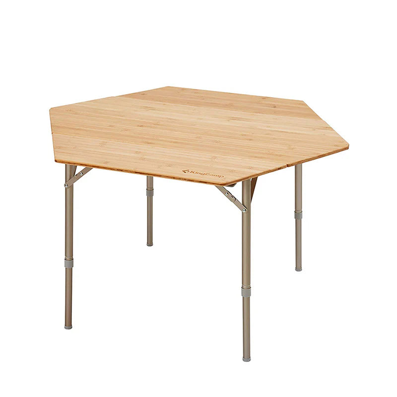 【KingCamp|キングキャンプ】アウトドアテーブル 折り畳み竹製 六角テーブル 高さ無段階調節(イエロー)