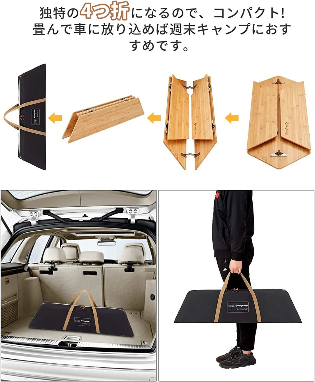 環境にやさしい天然竹を天板に使用。高級孟宗竹ならではの質感と耐久性で、自然の中でも美しく映えます。フレームには軽量かつ強靭なアルミニウム合金を採用し、重量を抑えながら抜群の安定感を実現しています。