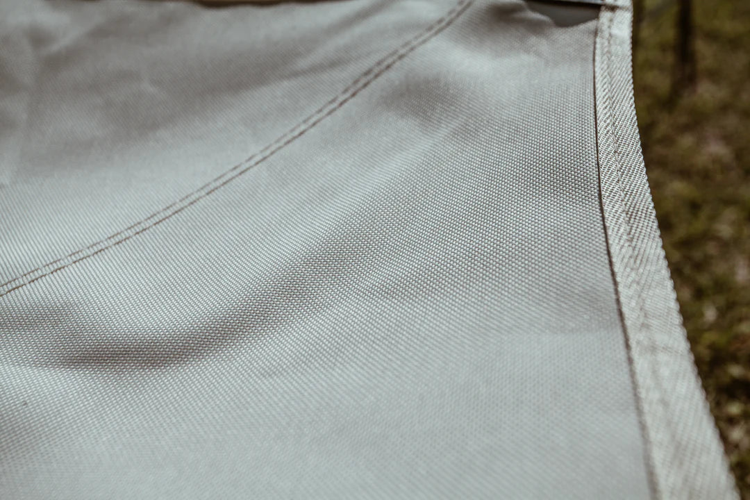 外幕は150Dオックスフォード(PU2000mm防水・裏面シルバーコーティング190Tポリエステル)、フロアマットは600Dオックスフォード(PU3000mm防水)。