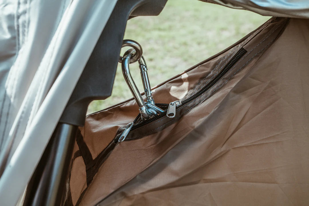 独自設計のアルミ&ナイロン複合ブラケットにより、テント内にハンモックを吊るせます。テントとハンモックが一体化し、遊び場・休憩スペース・昼寝テントとして多用途に活躍。