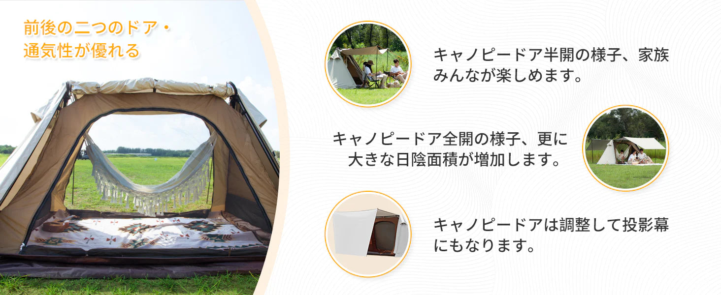 ハンモックを内蔵した革新的な構造で、家族や子どもたちが楽しめる新感覚のキャンプテント。風を感じながら星を眺め、自然の中で特別な時間を過ごせます。
