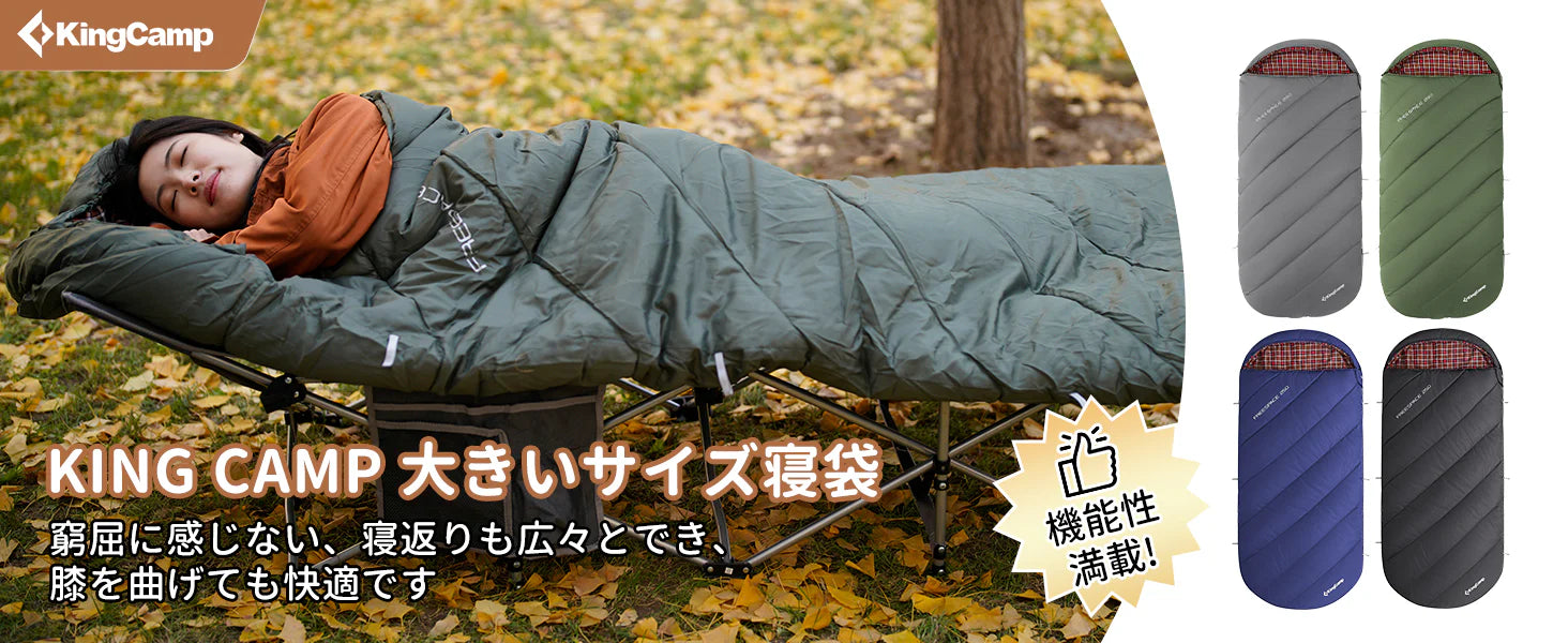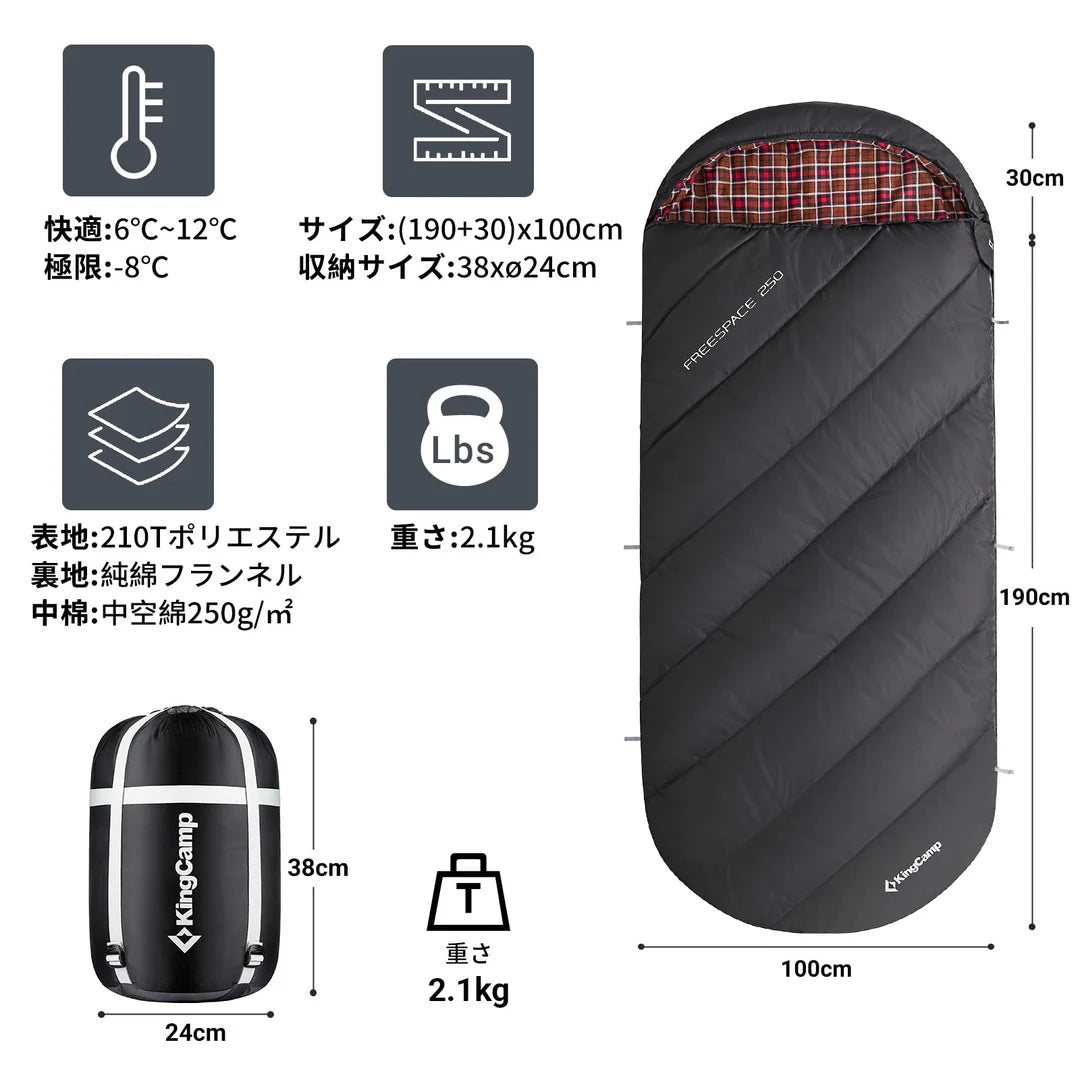 【KingCamp|キングキャンプ】FREESPACE 250|封筒型ワイド寝袋|フランネル裏地・オールシーズン対応(4カラー)