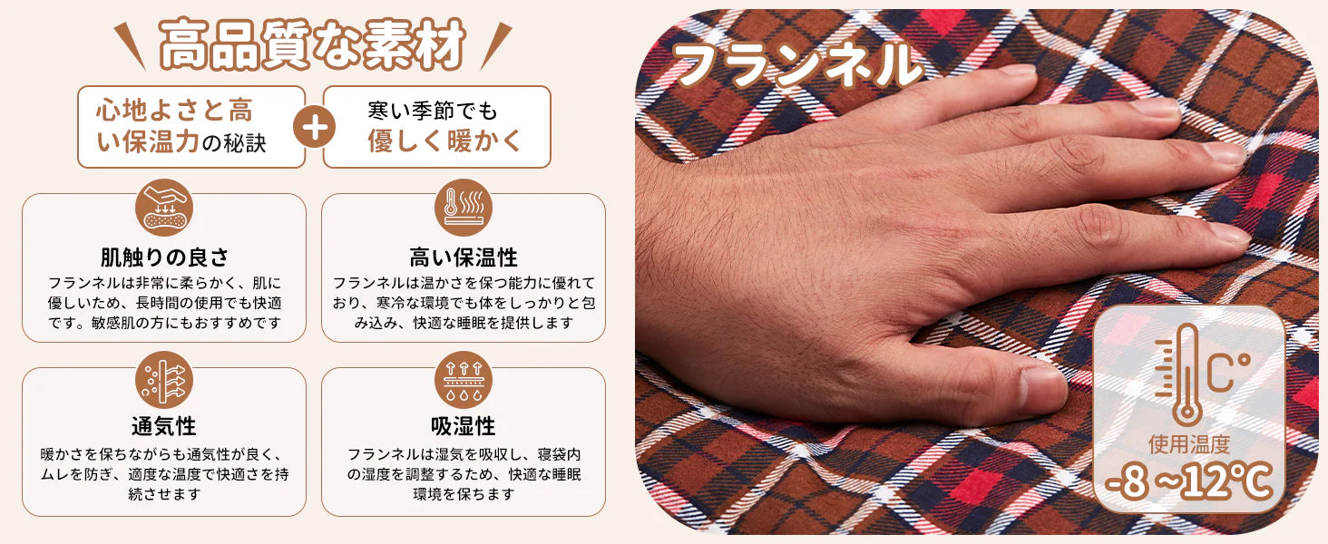 フランネル裏地で極上の肌触り:柔らかく暖かい質感で快眠サポート