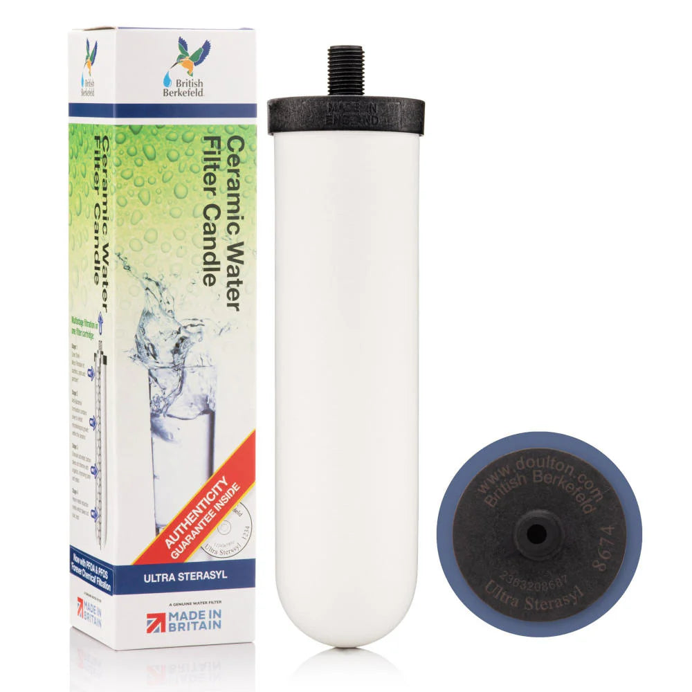 British Berkefeld(ブリティッシュバークフェルド)のUltra Sterasylは、マイクロフィルターセラミック外層・活性炭・重金属除去媒体を組み合わせた高性能フィルター。細菌・PFAS・マイクロプラスチック・医薬品・有機物・鉛など幅広い不純物を低減しながら、ミネラルは保持します。