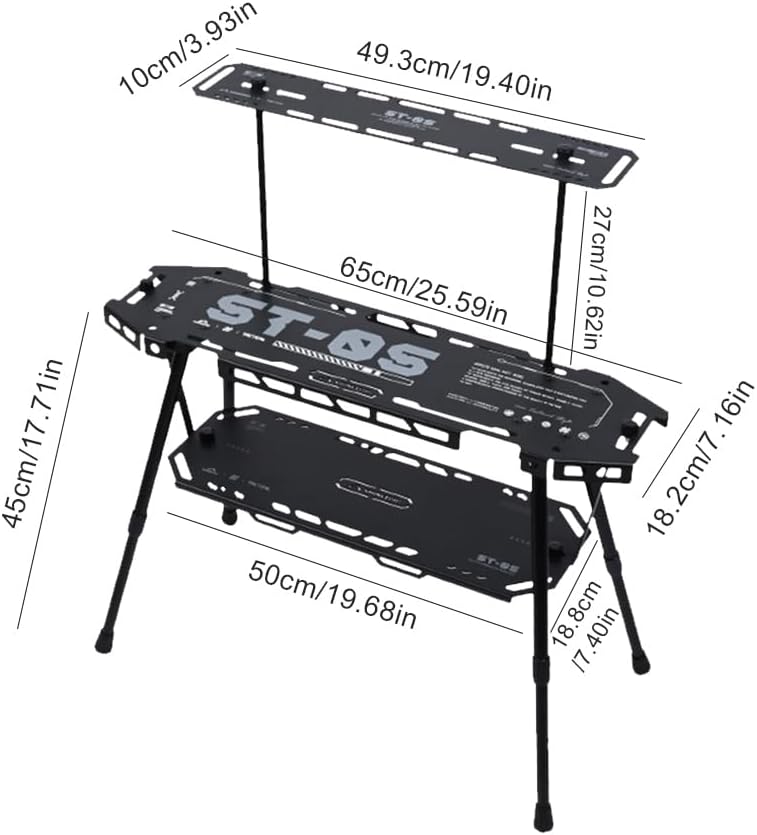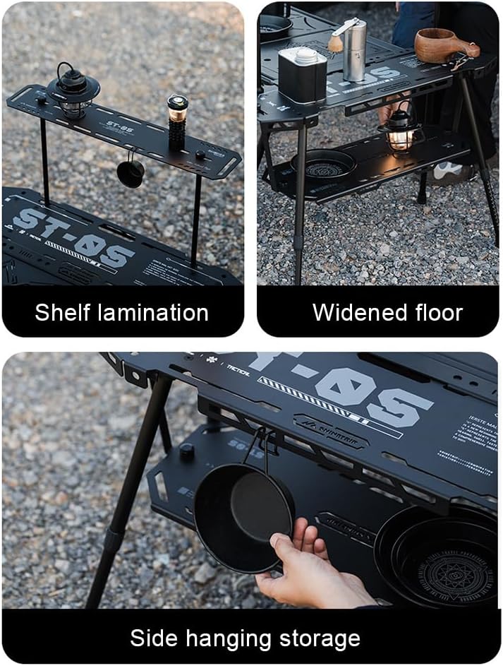 上段ラック・メイン天板・下段棚を組み合わせることで、調理道具・ランタン・小物を“縦に整理”でき、テーブル上の混雑を一気に解消します。