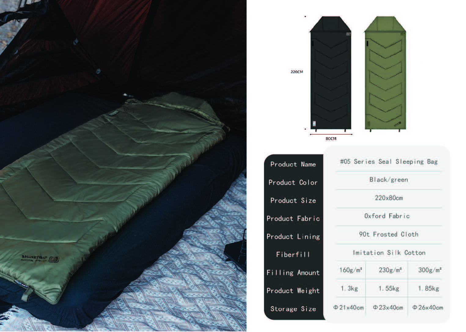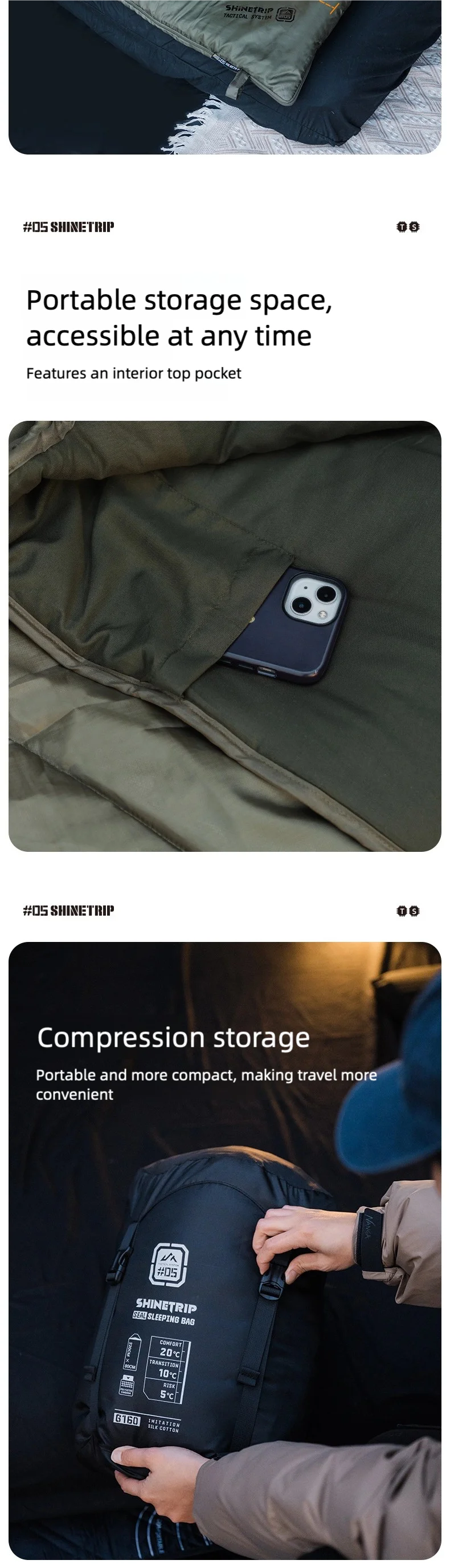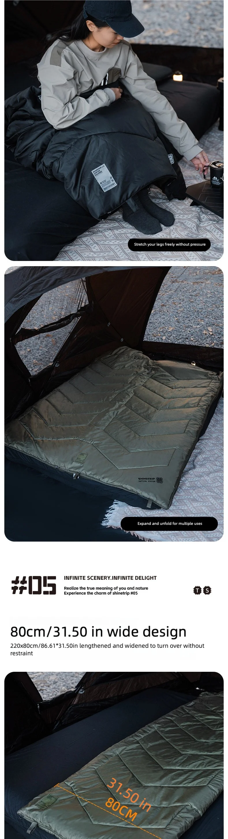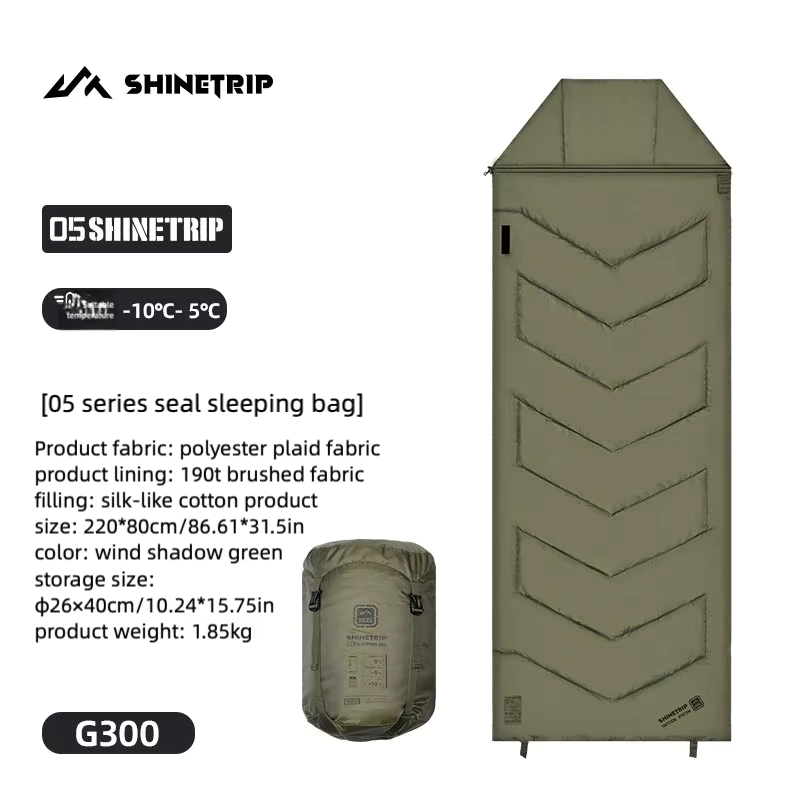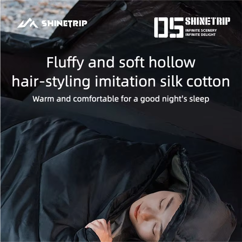 キャンプや車中泊で「寝袋だと窮屈」「マットの上でズレる」「朝方だけ冷える」と感じることは多いです。ShineTrip(山趣)#05 シリーズのシールスリーピングバッグは、220×80cmのゆったり設計で寝返りしやすく、封筒型の快適さと保温性を両立。さらに**中綿量を3タイプ(G160/G230/G300)**から選べるので、季節や標高に合わせて無理なく最適化できます。