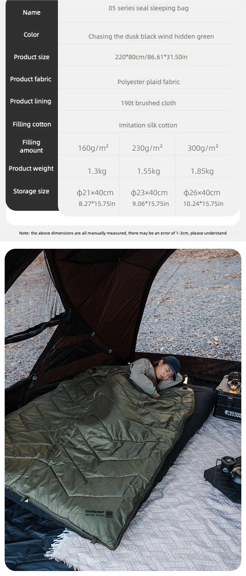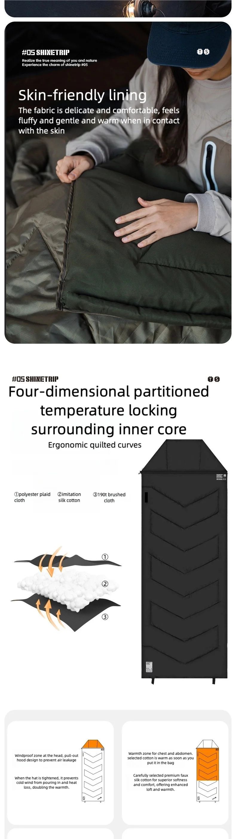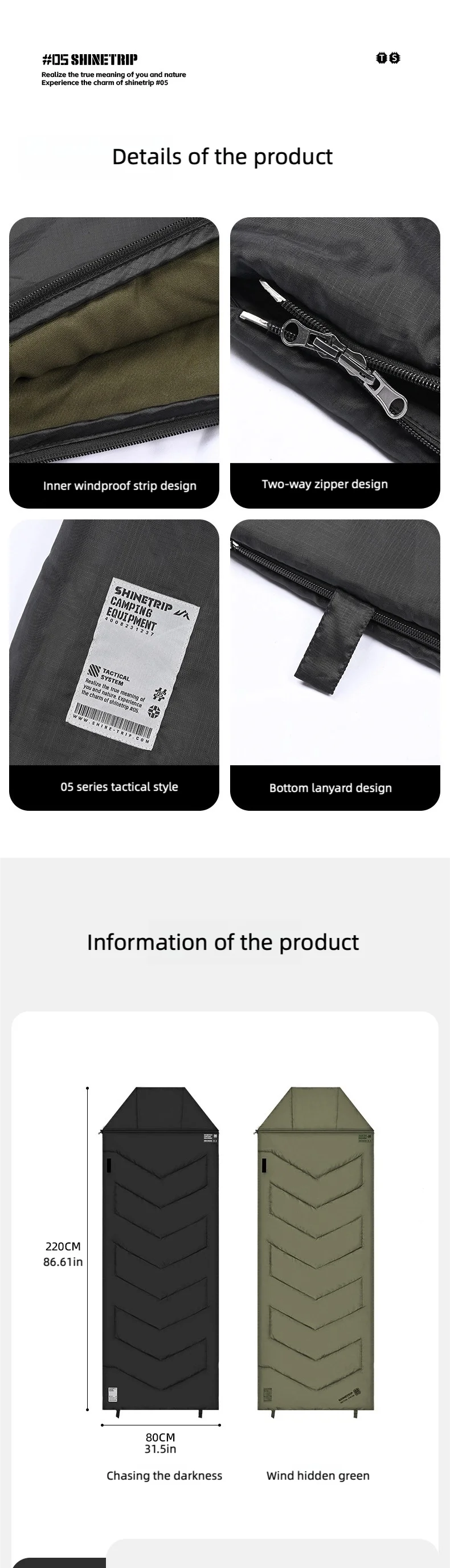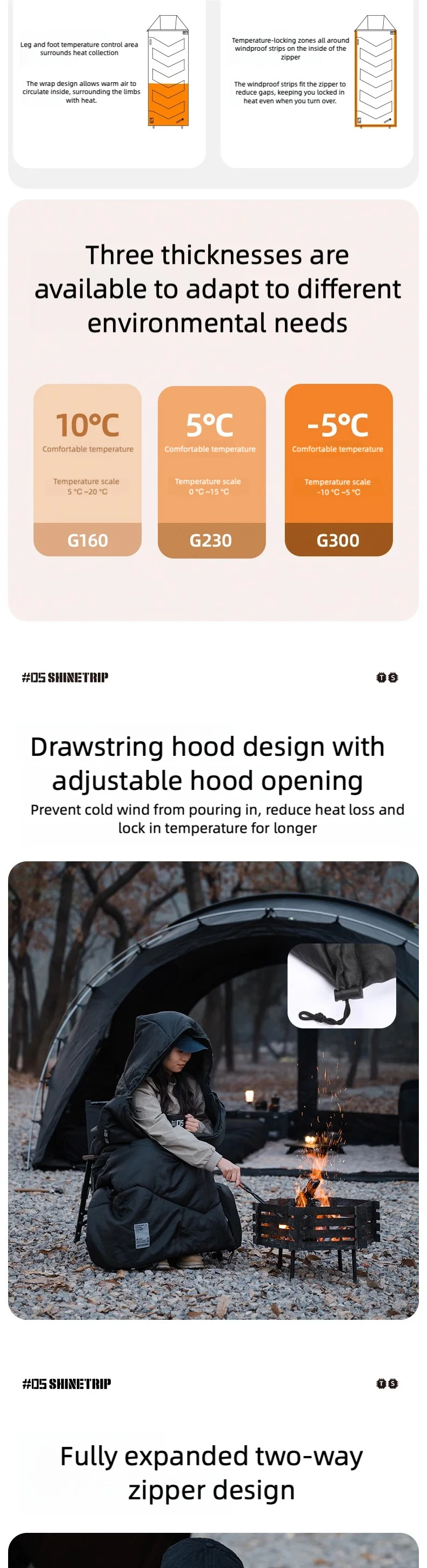 キャンプや車中泊で「寝袋だと窮屈」「マットの上でズレる」「朝方だけ冷える」と感じることは多いです。ShineTrip(山趣)#05 シリーズのシールスリーピングバッグは、220×80cmのゆったり設計で寝返りしやすく、封筒型の快適さと保温性を両立。さらに**中綿量を3タイプ(G160/G230/G300)**から選べるので、季節や標高に合わせて無理なく最適化できます。