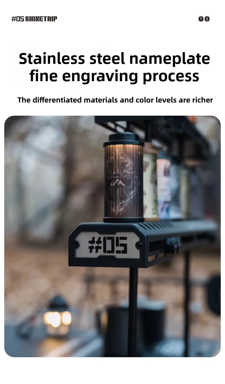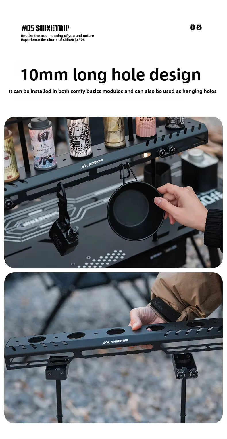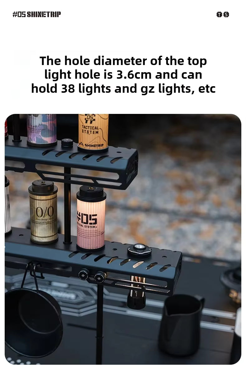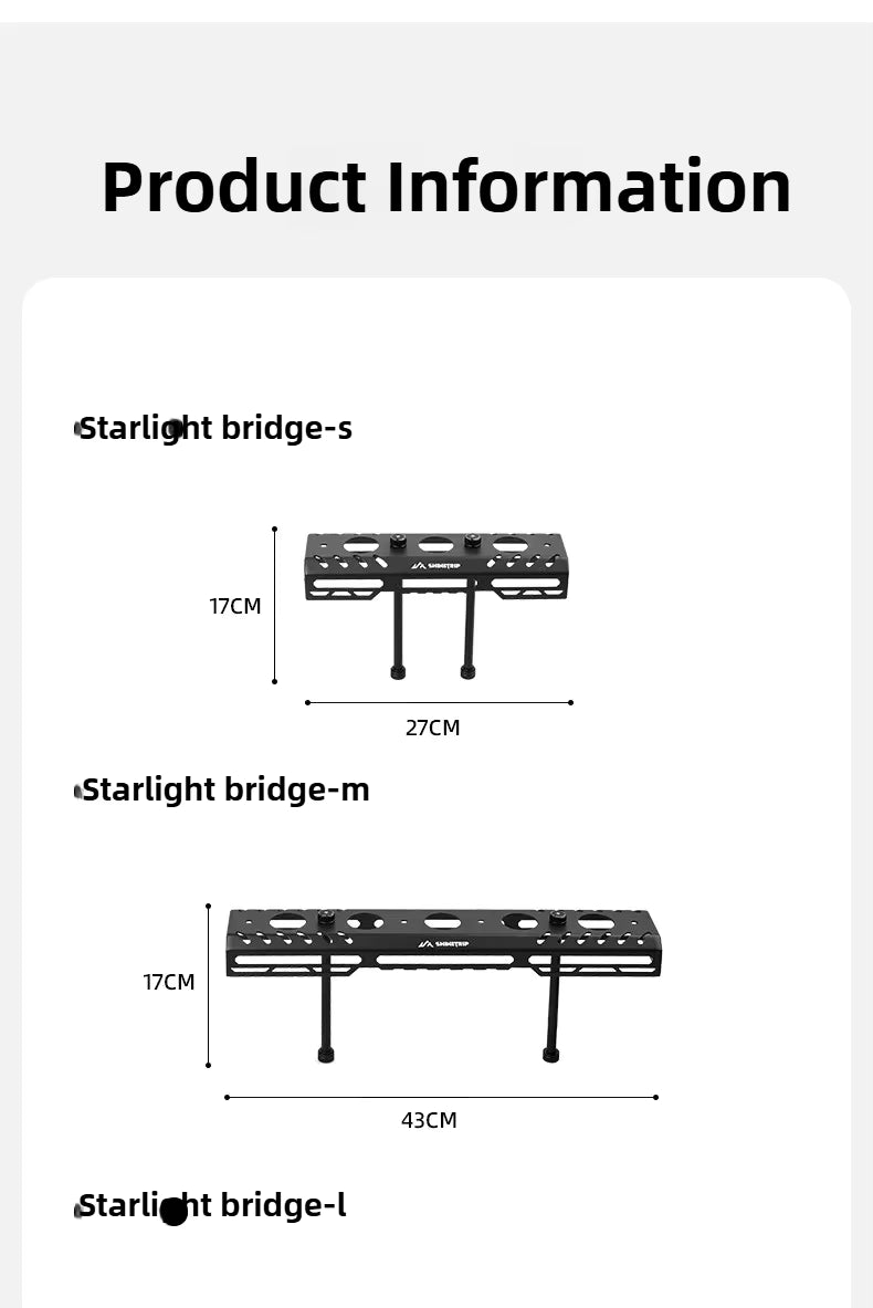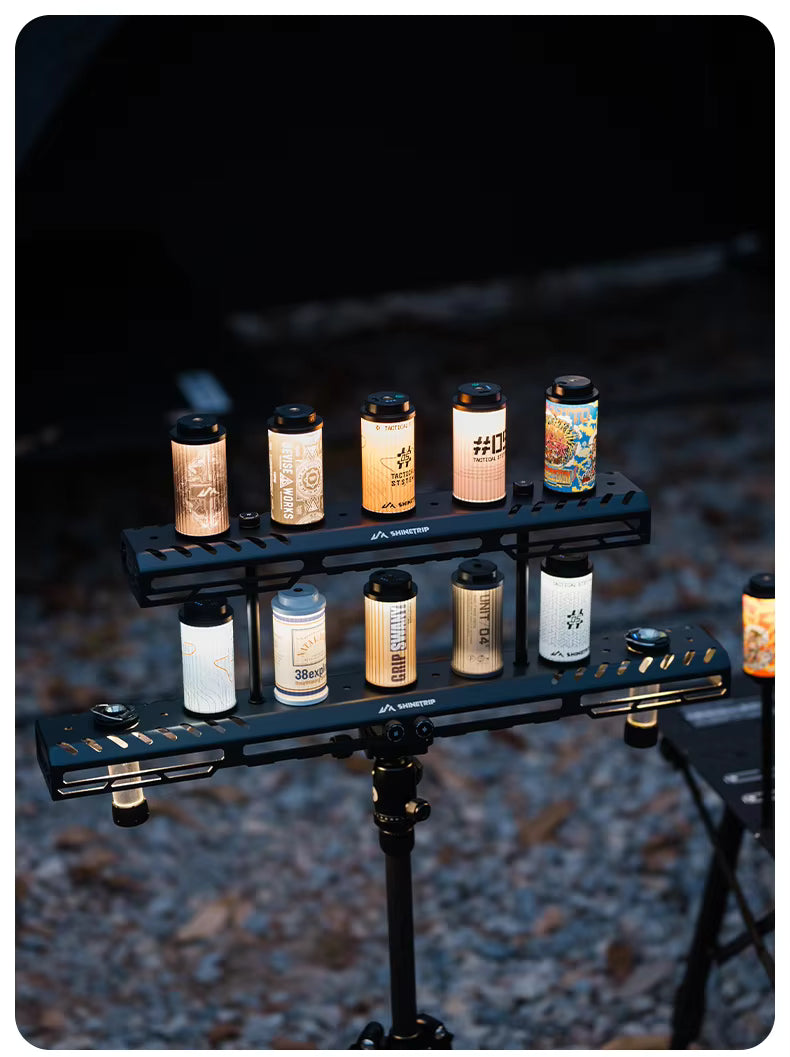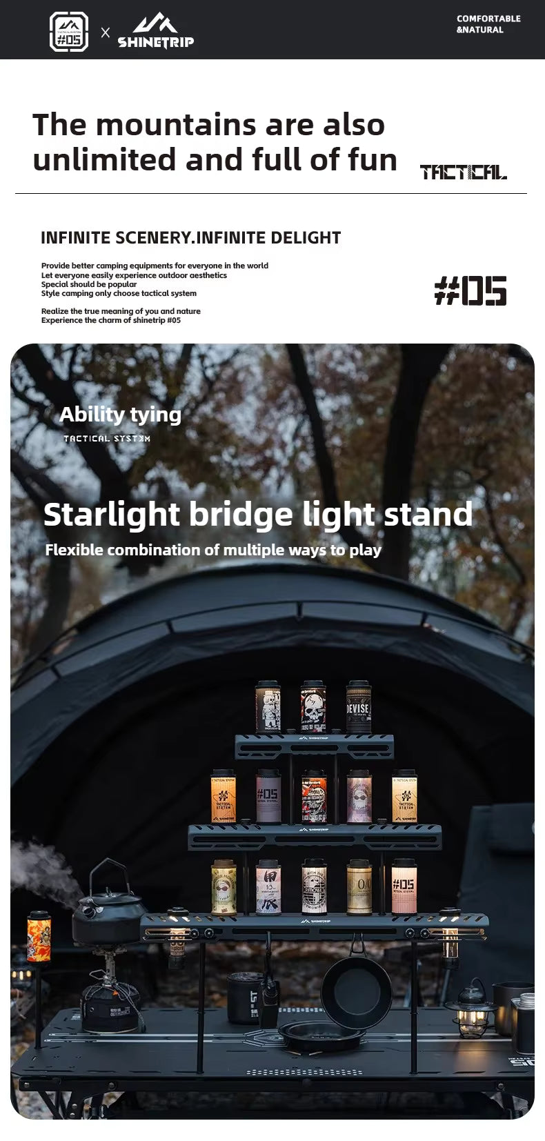 山趣(ShineTrip)ST-05シリーズの「38灯 スターライトブリッジ」関連パーツ。38灯(38-kT)を美しく並べて固定・ディスプレイできるブリッジ本体(S/M/L)に加え、拡張用のベーシックモジュールと延長アルミロッドを用意。サイトの雰囲気作りや撮影、テーブル周りのレイアウトに合わせて長さ・構成を選べます。