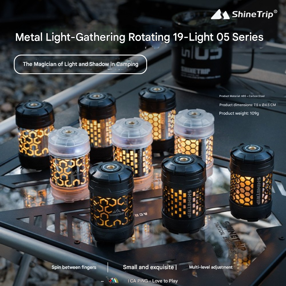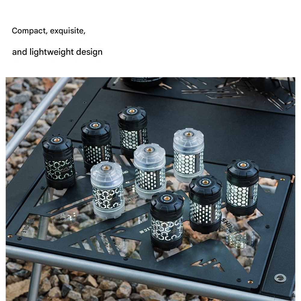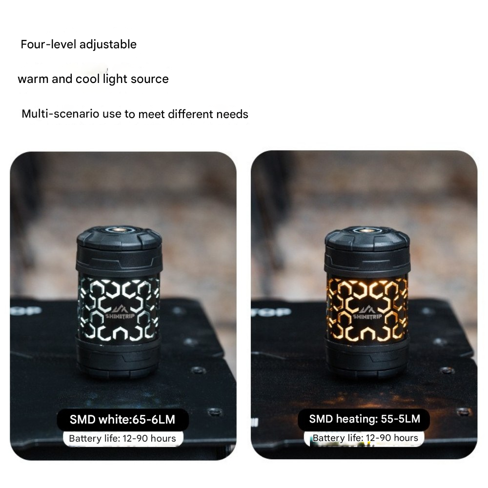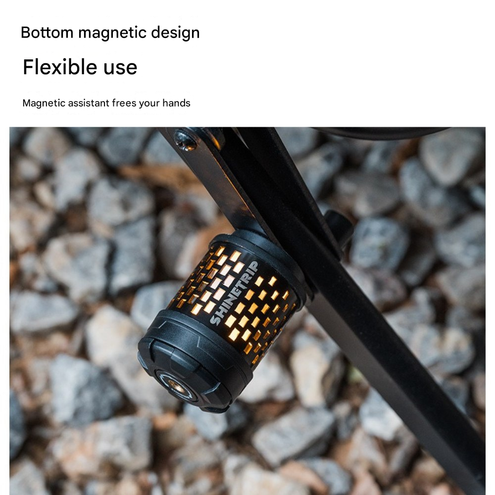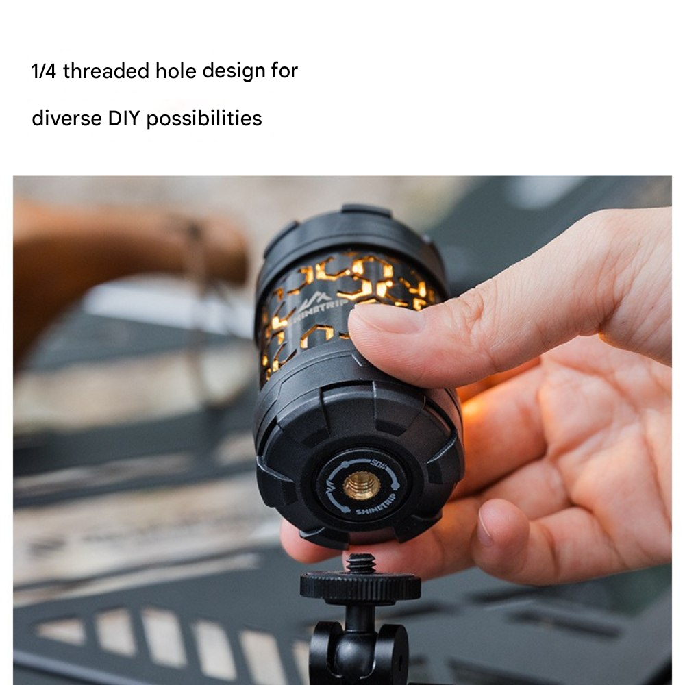 回転ギミックを備えたコンパクトライトユニット。指先で回して楽しめるデザインで、キャンプサイトの雰囲気作りやテーブル周りのアクセントに最適です。底面マグネットで金属面に固定でき、1/4インチネジ穴によりスタンドや各種アタッチメントへの拡張も可能。暖色/寒色のデュアル光源、4段階調光+長押し無段階調光に対応し、シーンに合わせた光量調整ができます。Type-C充電、1000mAh(18350)バッテリー内蔵。