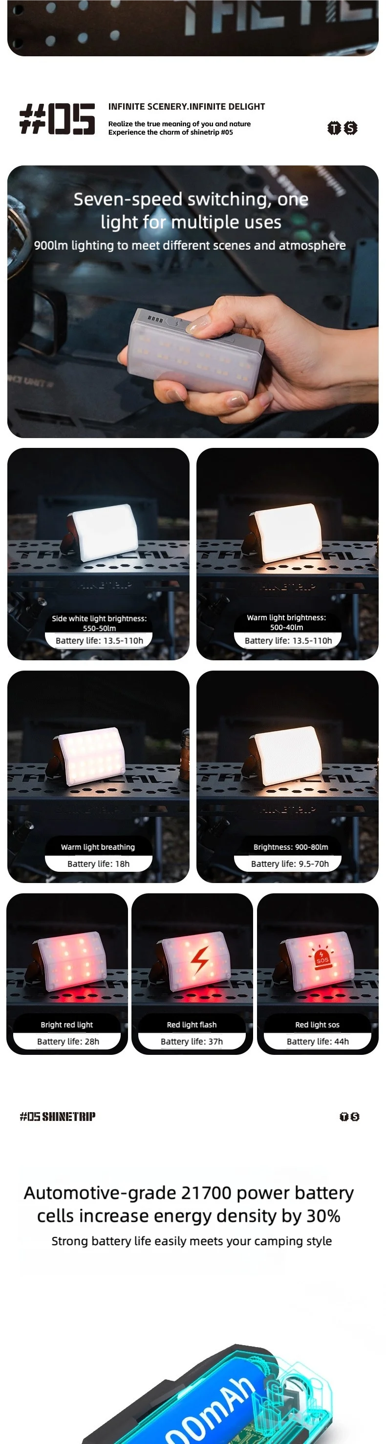 テント内の読書灯、就寝前の常夜灯、車中泊の補助照明、防災用バックパックへの常備灯として、多用途に対応します。