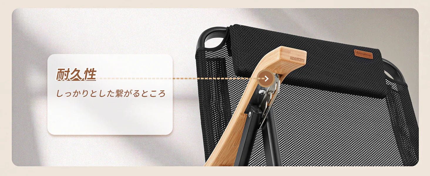 取り外し可能なコットン入りクッションと枕で快適なリラックスを提供。アームレストには竹素材を使用し、手触りの良さとナチュラルな質感を両立。シートは600Dメッシュとポリエステルで通気性が良く、夏も快適に使用できます。