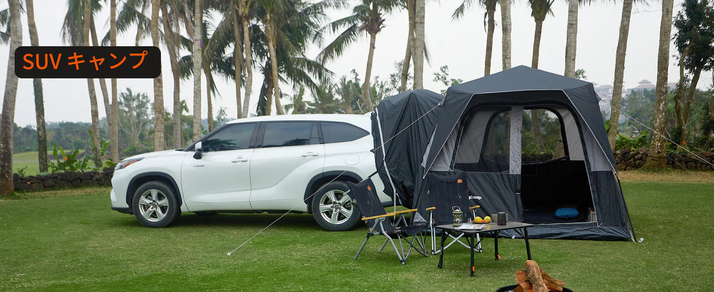 SUV、JEEP、ミニバン、ピックアップトラック(キャップ付き)など幅広い車種に対応。取り外せば独立型テントとしても使用でき、車中泊・ファミリーキャンプ・防災用途など多彩なシーンに対応します。