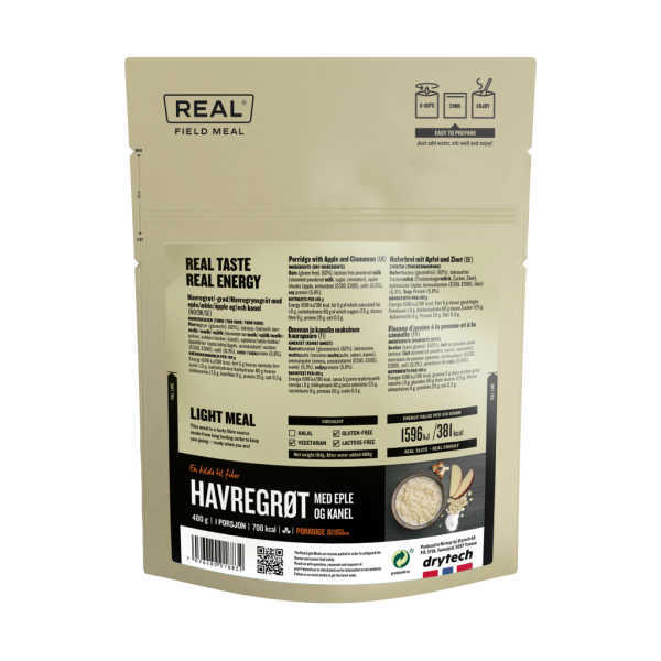ノルウェーのフリーズドライ食品ブランドReal Field Mealのアップル&シナモン ポリッジは、アウトドアや過酷環境でも高カロリー補給が可能な高エネルギー朝食です。