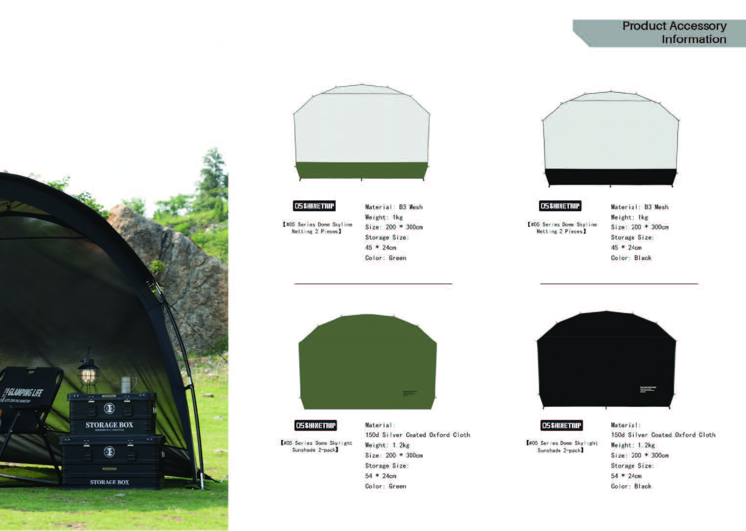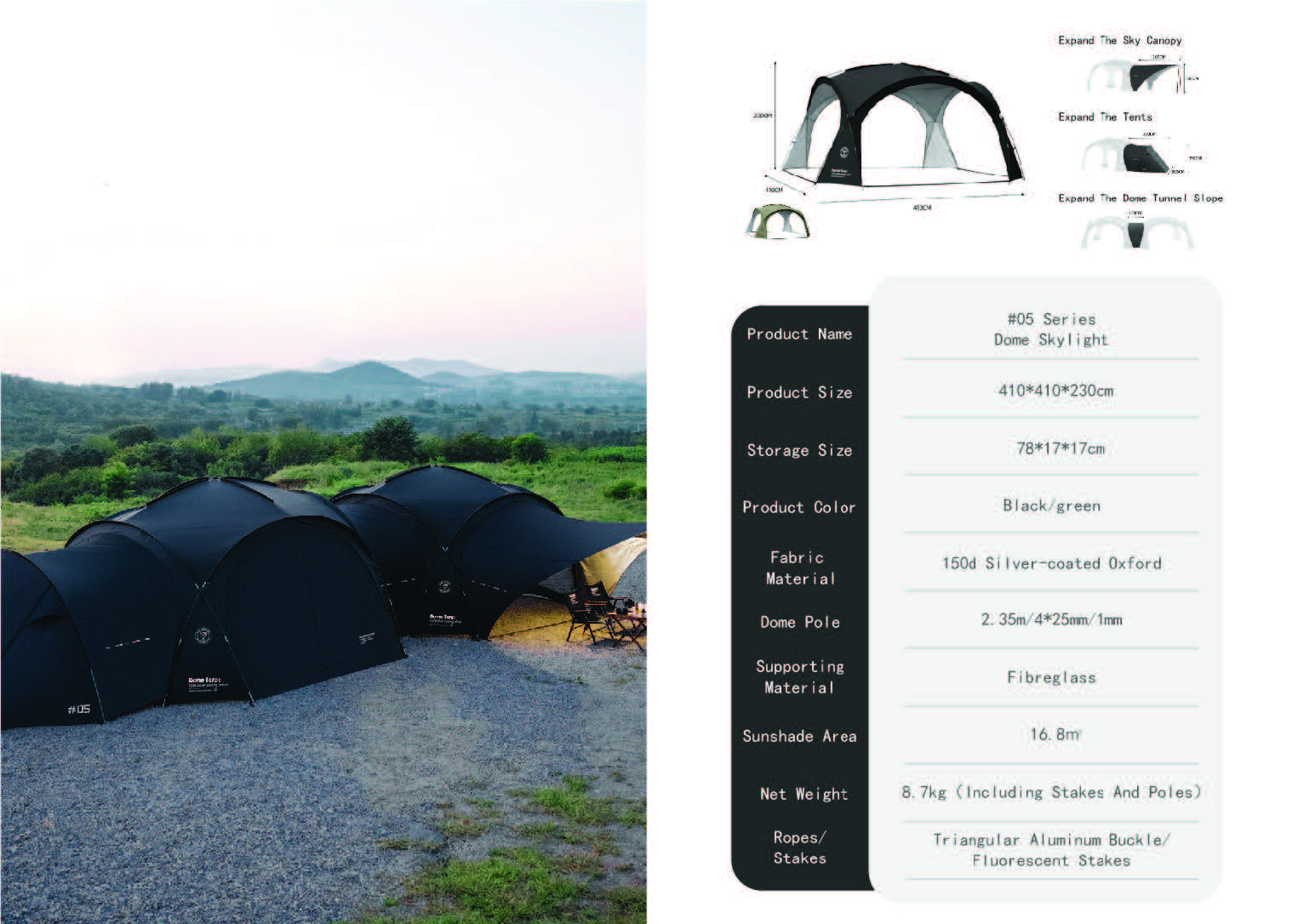 | Dome Skylight / Black | A470-M00 | 150D Silver-Coated Oxford + Aluminum Alloy | 410×410×230cm | 79×17×17cm | 7.0kg |